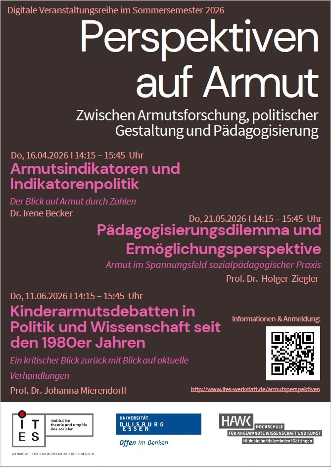In der Veranstaltungsreihe möchten wir einen Anstoß geben, zentrale Themen der Armutsforschung zu reflektieren, gesellschaftliche Narrative zu hinterfragen und den Brückenschlag zwischen Theorie und Praxis zu fördern. Die Reihe bietet die Gelegenheit, zentrale Fragen rund um die Messung, die gesellschaftliche Wahrnehmung, die pädagogische Dimension und konkrete Erfahrungen zu diskutieren. Die Veranstaltung richtet sich an Armutsforscher*innen, Praktiker*innen aus der Sozialen Arbeit, Pädagogik, Politik sowie an alle Interessierten, die einen kritischen Blick auf den aktuellen Diskurs im Bereich Armut werfen möchten.